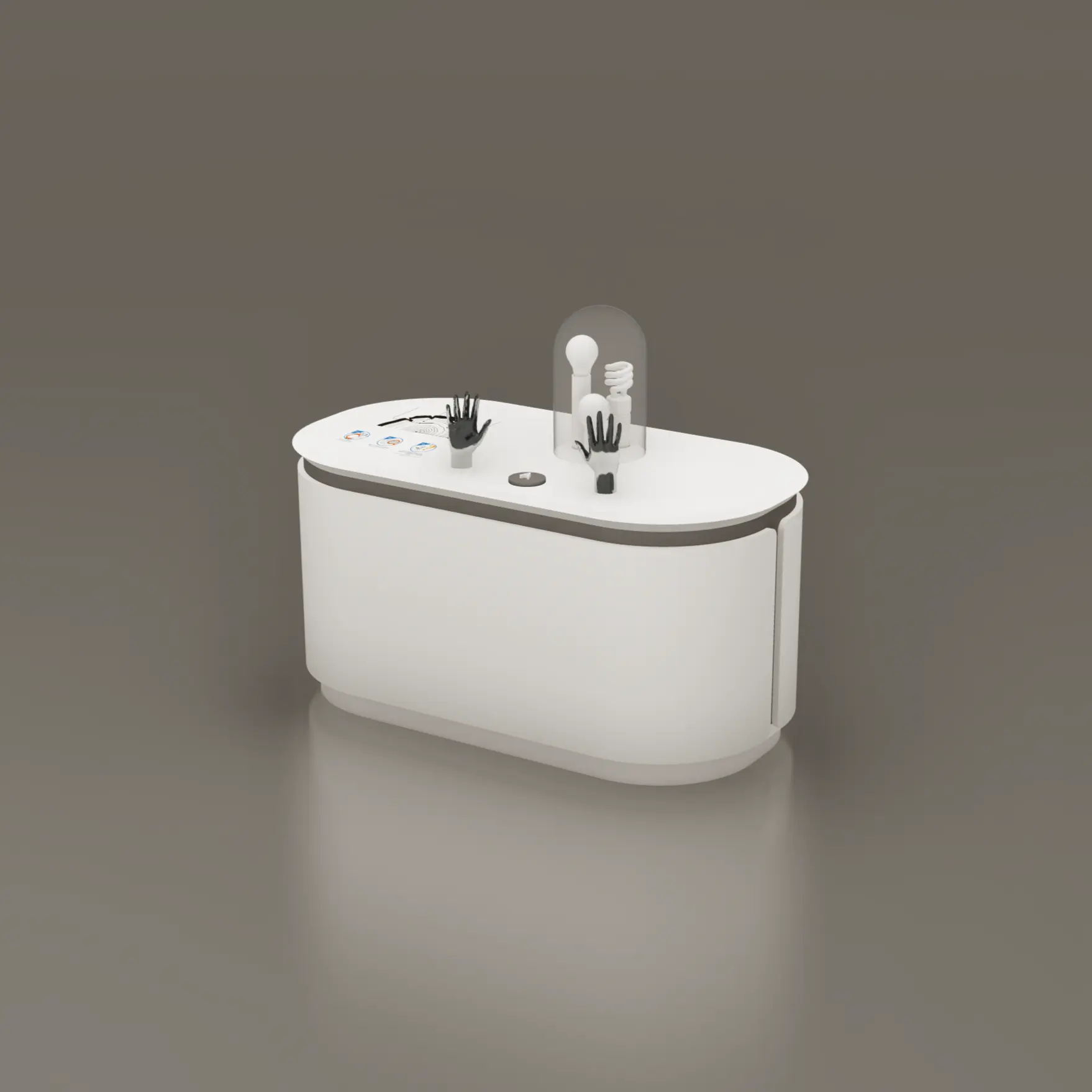 By holding the two conductive hand figures and, if necessary, holding hands with another visitor, visitors experience the completion of the current through their own bodies. As a visual stimulus, the light bulb lights up when the circuit is completed and a current meter accompanying the bulb measures the voltage and allows the visitor to read it on the display panel.